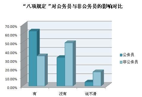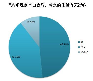 截至2013年12月20日10時(shí),共收到網(wǎng)絡(luò)問卷2442份,48.4%的受訪者認(rèn)為“八項(xiàng)規(guī)定”對個人生活有影響,其中公務(wù)員群體認(rèn)為“八項(xiàng)規(guī)定”帶來的最大影響是“公務(wù)吃請少了,能抽出更多時(shí)間陪伴家人”和“津貼補(bǔ)貼獎金少了,勒緊褲帶過日子”,非公務(wù)員群體認(rèn)為“八項(xiàng)規(guī)定”帶來的最大影響是“酒店、高端會所門外的公務(wù)用車少了”和“遇到領(lǐng)導(dǎo)考察工作時(shí),地毯鮮花迎送領(lǐng)導(dǎo)的情況少了”。
