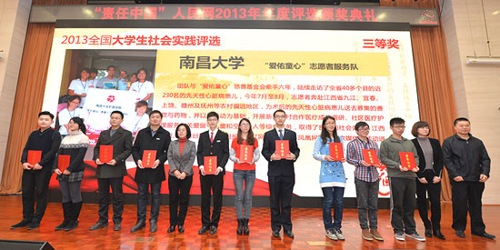 人民網(wǎng)北京1月15日電 (記者 張葳)1月15日,2013全國大學(xué)生社會實踐評選活動舉行頒獎和座談活動,獲獎大學(xué)生代表上百個團(tuán)隊發(fā)表了倡議書,號召全國大學(xué)生們在社會實踐中做到“行動落實處,愛心不間斷”,經(jīng)常性、持續(xù)性地走進(jìn)社會、服務(wù)基層,拒絕形式主義。