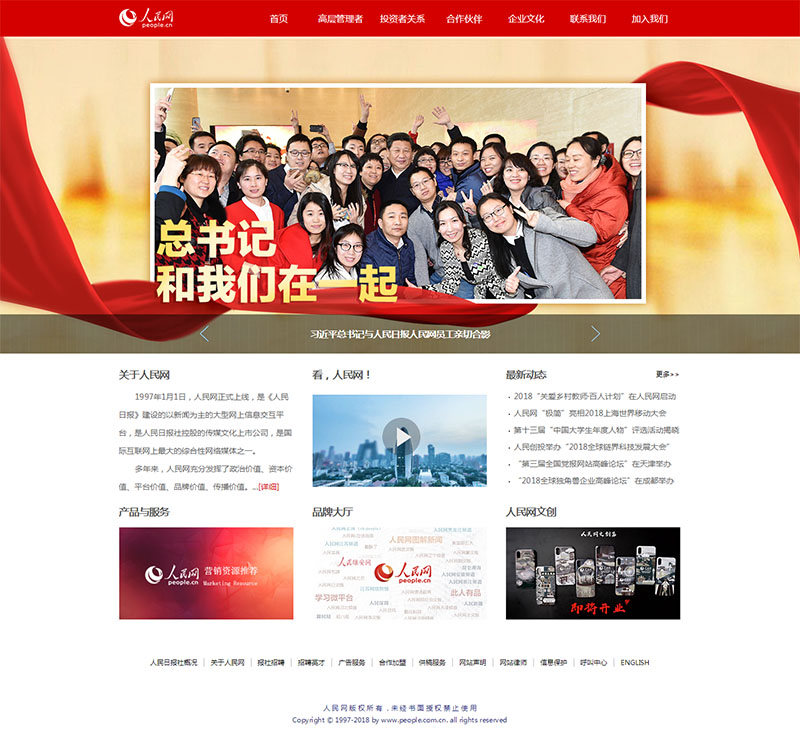 改版后,內(nèi)容呈現(xiàn)上既有人民網(wǎng)實(shí)力的全面展示,也突顯了上市公司的專業(yè)化形象。為了便于網(wǎng)友“零距離接觸”人民網(wǎng),頁面主展示區(qū)劃分成“關(guān)于人民網(wǎng)”“看,人民網(wǎng)!”“最新動(dòng)態(tài)”“產(chǎn)品與服務(wù)”“品牌大廳”“人民網(wǎng)文創(chuàng)”六大塊區(qū)域,內(nèi)容重點(diǎn)突出,直觀醒目。