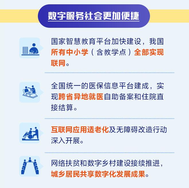 與此同時(shí),《報(bào)告》介紹,在數(shù)字服務(wù)社會(huì)方面,國家智慧教育平臺(tái)加快建設(shè),我國所有中小學(xué)(含教學(xué)點(diǎn))全部實(shí)現(xiàn)聯(lián)網(wǎng)。全國統(tǒng)一的醫(yī)保信息平臺(tái)建成,實(shí)現(xiàn)跨省異地就醫(yī)自助備案和住院直接結(jié)算;ヂ(lián)網(wǎng)應(yīng)用適老化及無障礙改造行動(dòng)深入開展。網(wǎng)絡(luò)扶貧和數(shù)字鄉(xiāng)村建設(shè)接續(xù)推進(jìn),城鄉(xiāng)居民共享數(shù)字化發(fā)展成果。