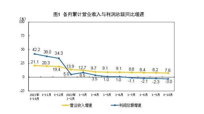 國家統(tǒng)計(jì)局?jǐn)?shù)據(jù)顯示,今年前10個(gè)月,全國規(guī)模以上工業(yè)企業(yè)營業(yè)收入同比增長7.6%,利潤同比下降3%。國家統(tǒng)計(jì)局工業(yè)司高級統(tǒng)計(jì)師朱虹解讀工業(yè)企業(yè)利潤數(shù)據(jù)時(shí)表示,總體看,工業(yè)企業(yè)利潤下降,結(jié)構(gòu)繼續(xù)改善,部分中下游行業(yè)利潤回升明顯。但也要看到,近期國內(nèi)疫情散發(fā)多發(fā),世界經(jīng)濟(jì)衰退風(fēng)險(xiǎn)加劇,工業(yè)企業(yè)效益恢復(fù)面臨較大壓力。